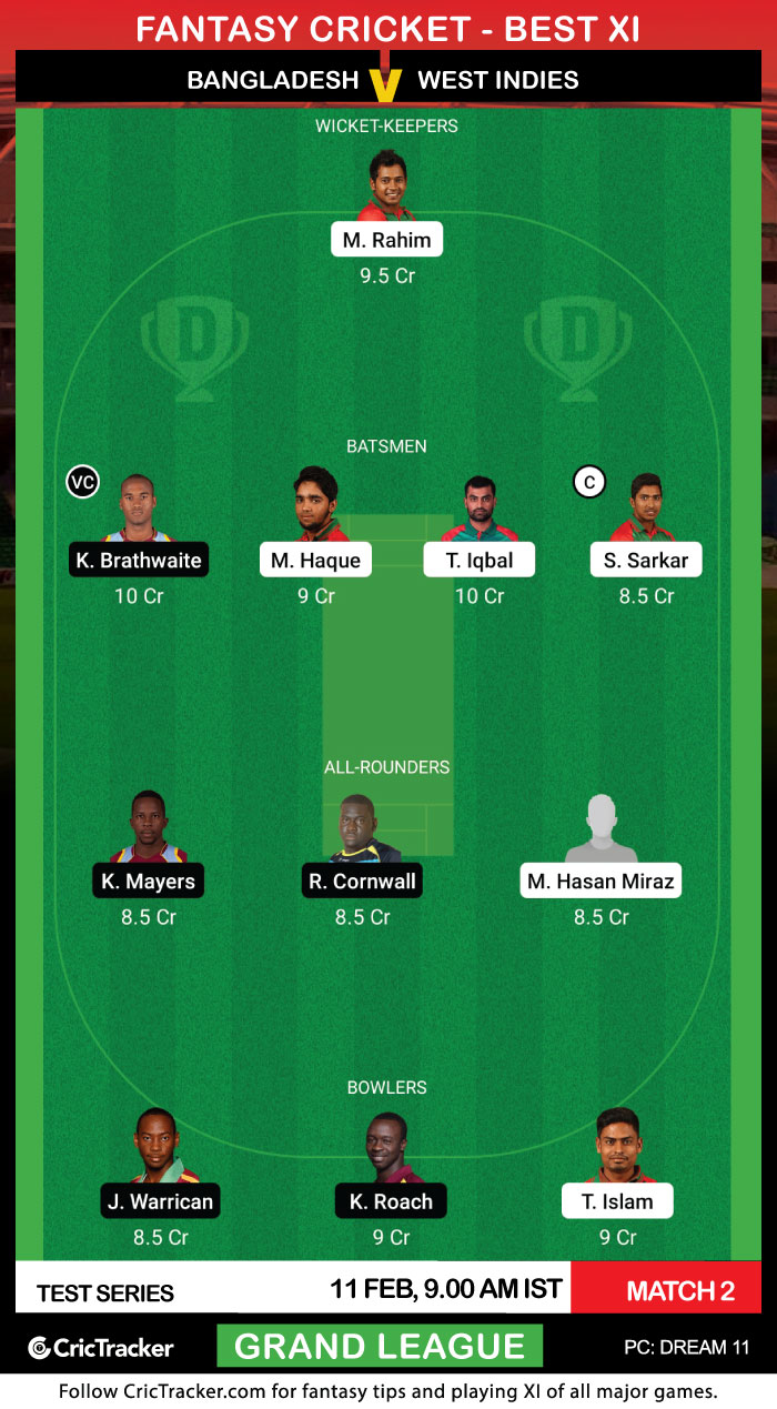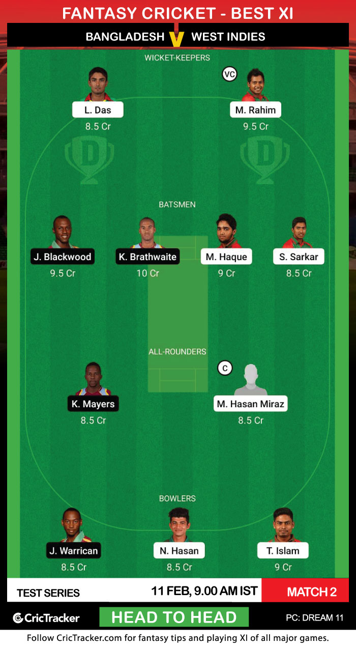 Suggested Playing XI No.2 for BAN vs WI Dream11 Fantasy Cricket:
