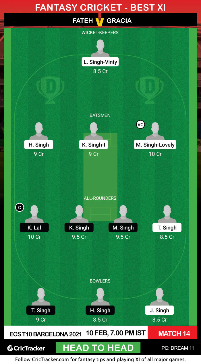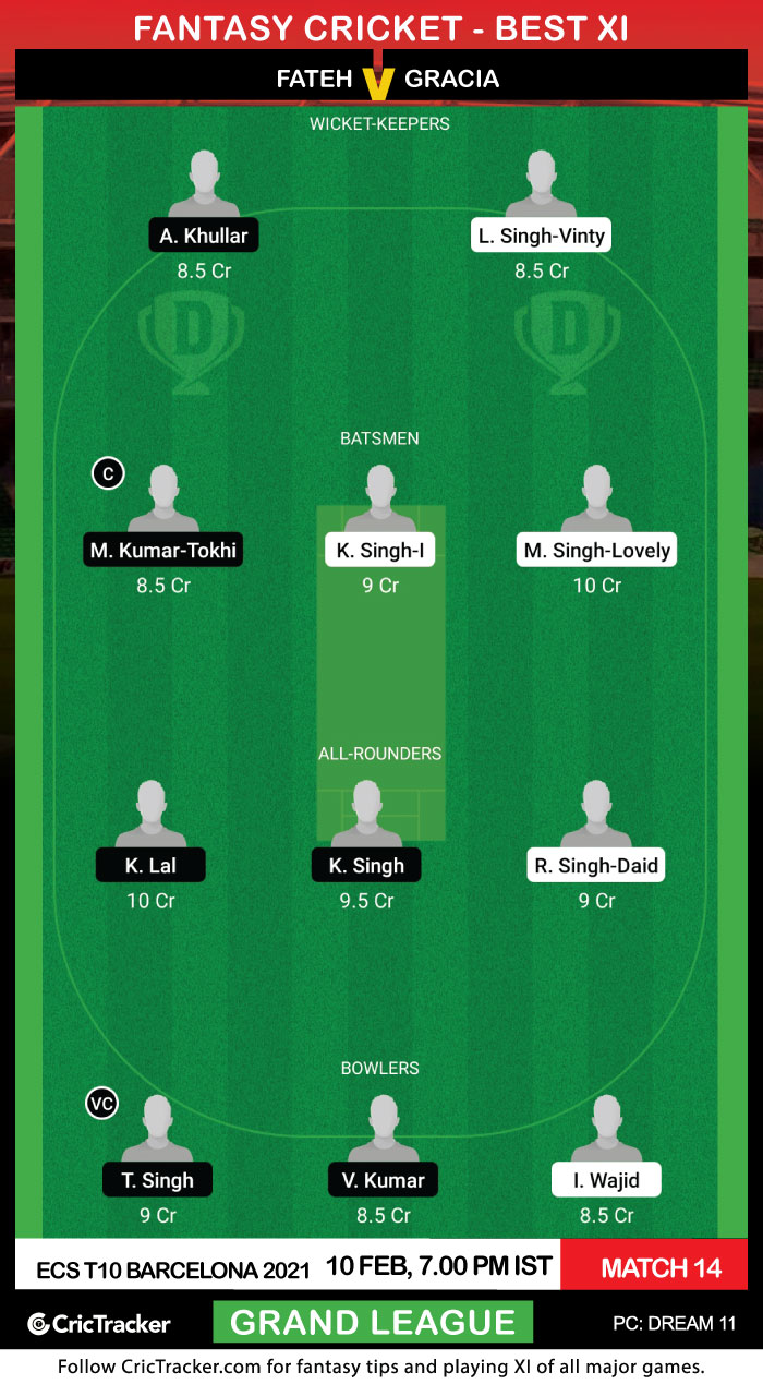 The 14th match of the ECS T10 2021 will be played between Fateh and Gracia on 10th February at Montjuic Olympic Ground in Barcelona.