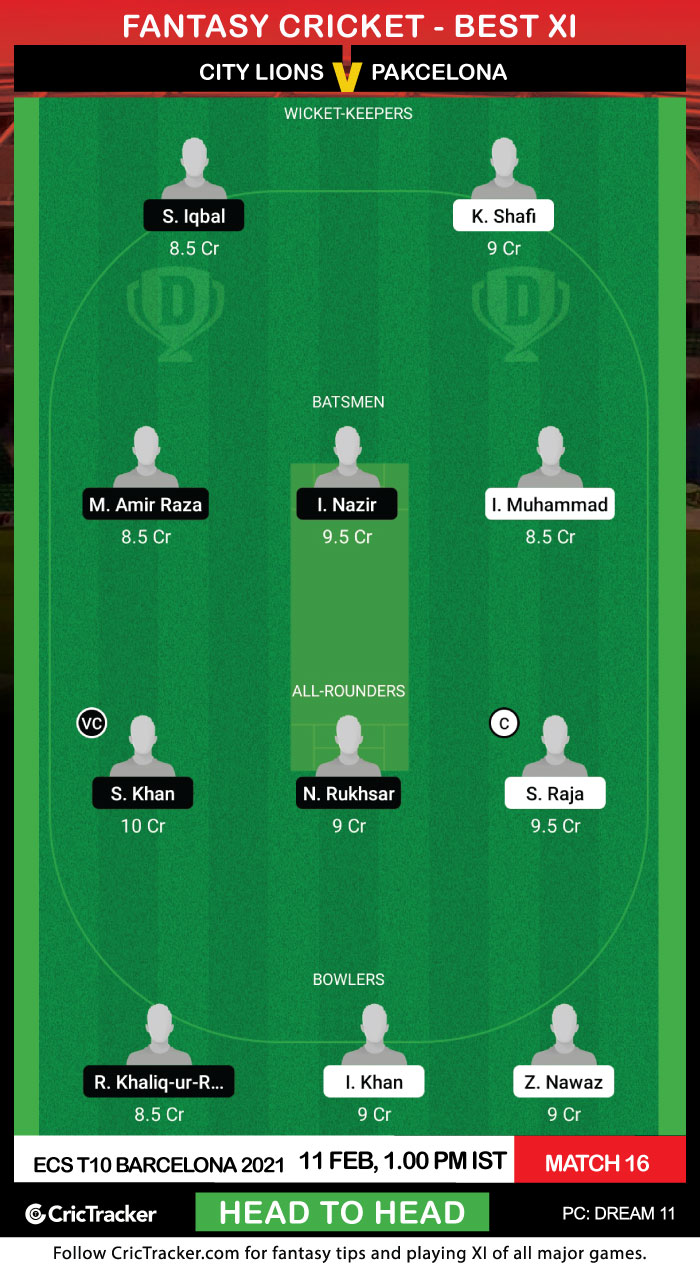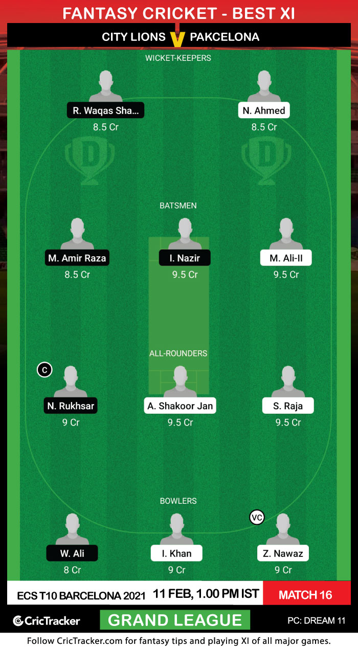 The 16th match of the ECS T10 2021 will be played between City Lions and Pakcelona on 11th February, at the Montjuic Olympic Ground in Barcelona.