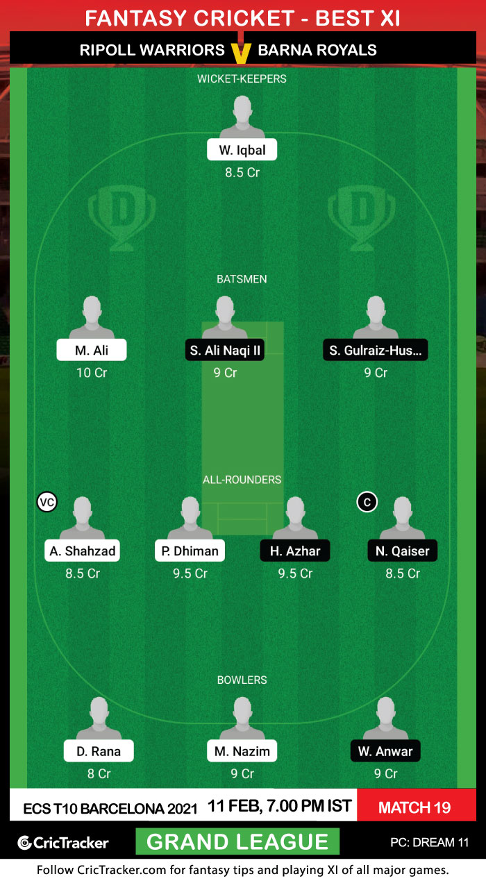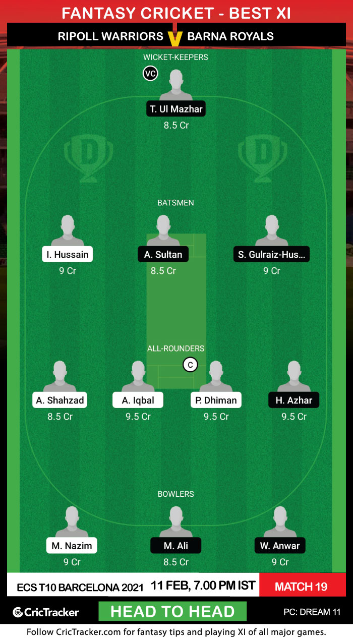The 19th match of the ECS T10 2021 will be played between Ripoll Warriors and Barna Royals on 11th February, at the Montjuic Olympic Ground in Barcelona.