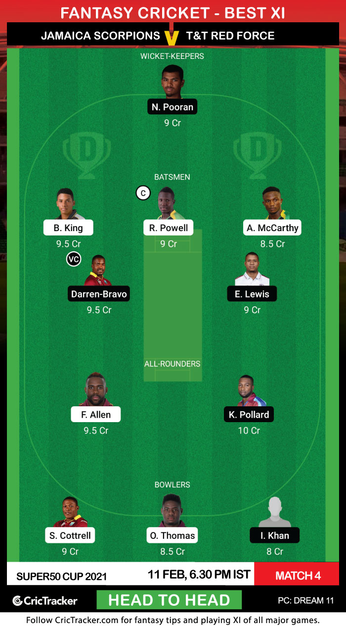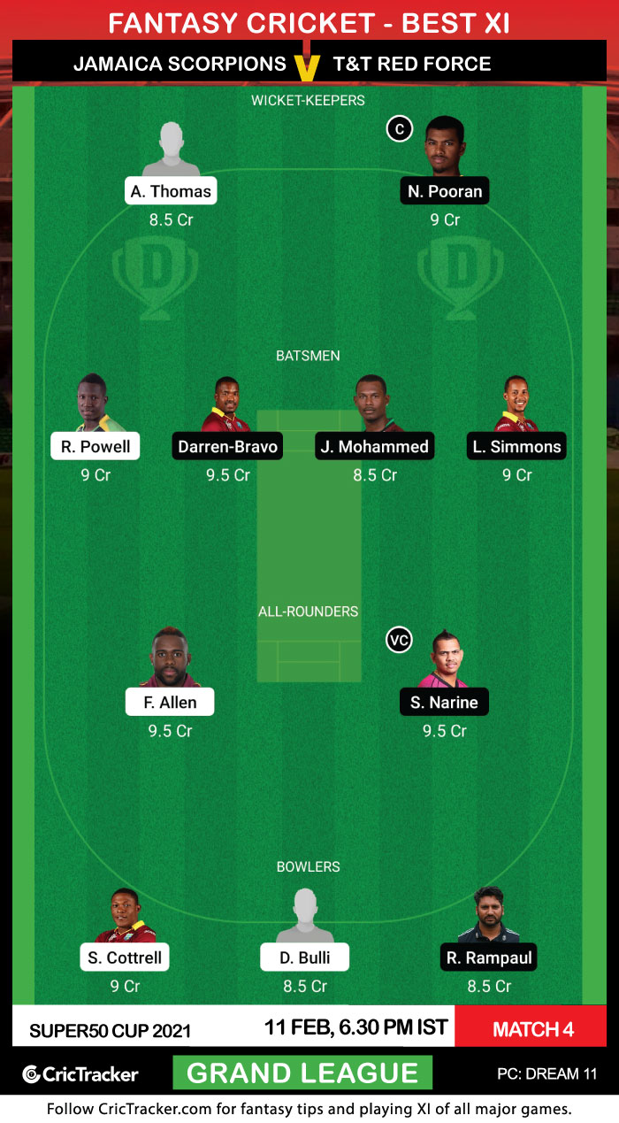 The 4th match of the Super50 Cup 2021 will be played between Jamaica Scorpions and T&T Red Force on 11th February at Coolidge Cricket Ground in Antigua.