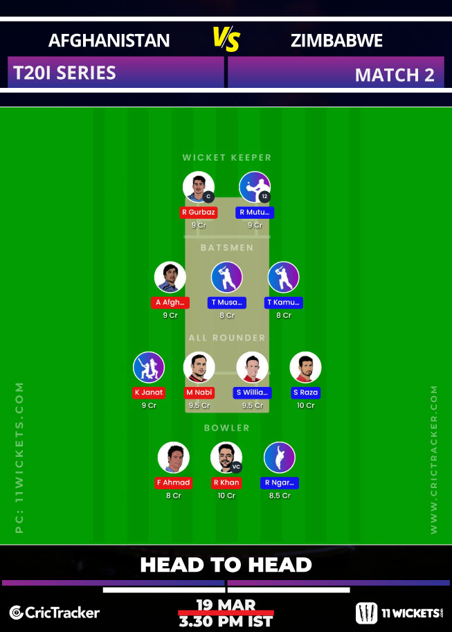 Rahmanullah Gurbaz played a brilliant knock of 87 runs in the last game and he continues to be a hot pick for this match. Karim Janat opened the innings scoring 26 runs and then picked two wickets as well. Rashid Khan picked up three wickets and continued to make an impact. For Zimbabwe, Sean Williams continues to be a top pick despite his failure in the first T20I. Tinashe Kamunhukamwe and Muzarabani are the other top picks for this match.