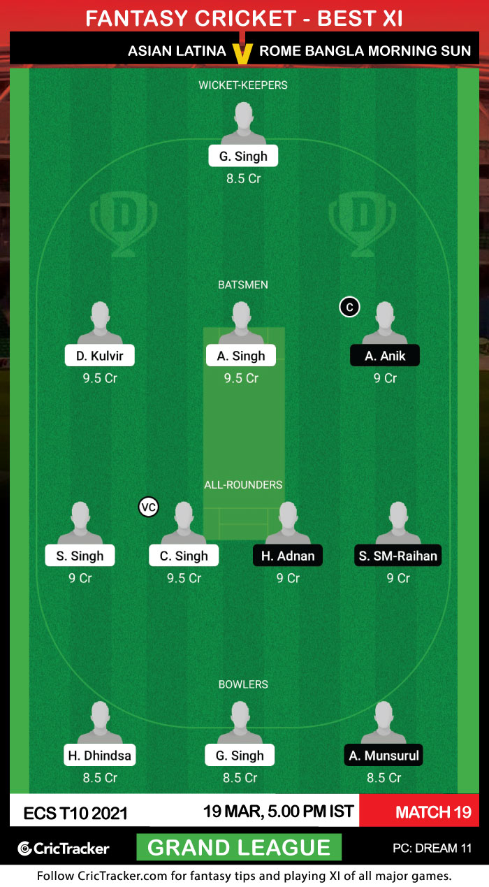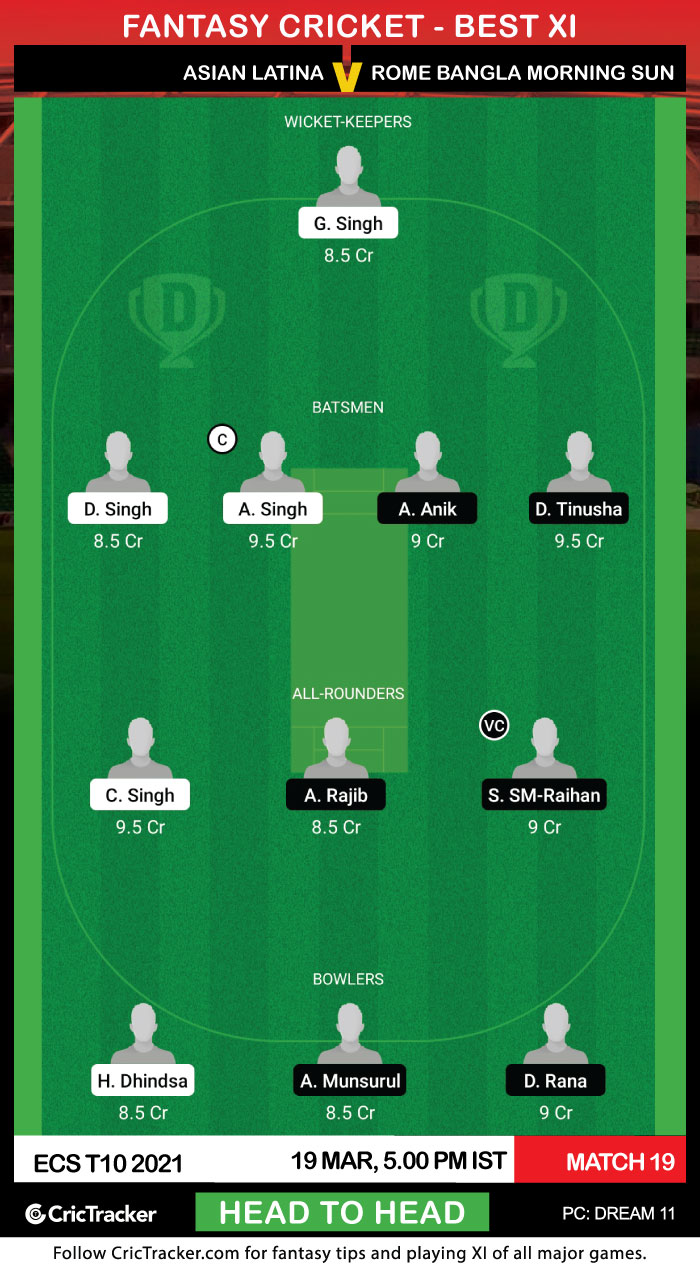 Asian Latina will take on Rome Bangla Morning Sun in the 19th Match of ECS T10 Rome 2021. Asian Latina would be eyeing to get back their top position in the points table. So far they have played good cricket and have five wins in six games.