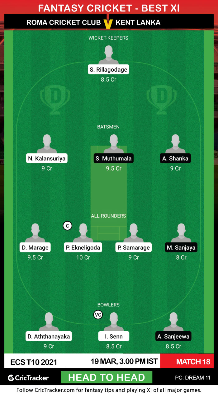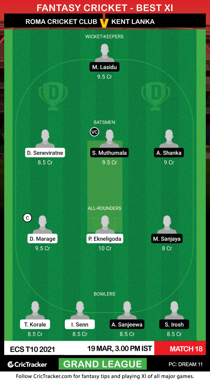 Match 18 of the ECS T10 2021 will be played between Roma Cricket Club and Kent Lanka at the Roma Cricket Ground in Rome on 19th March, Friday.