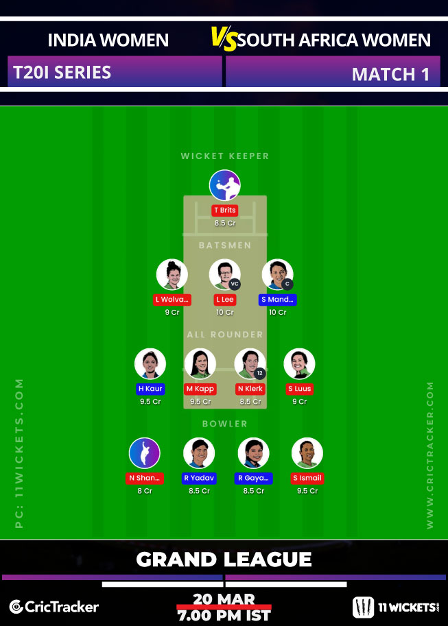 Suggested Playing XI No.1 for IN-W vs SA-W 11Wickets Fantasy Cricket: