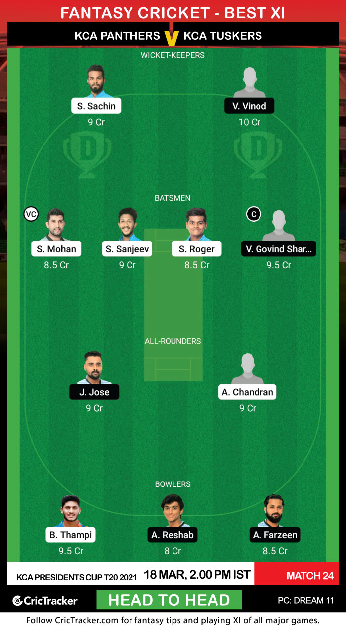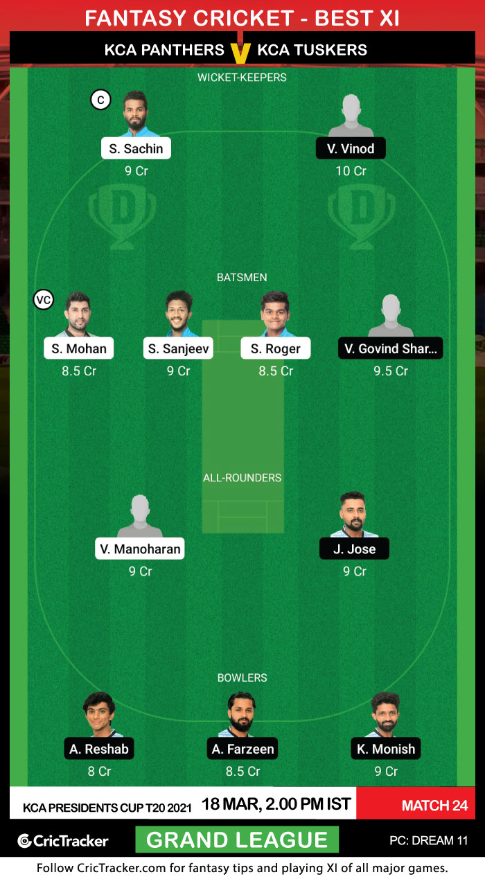It is advisable to pick Vathsal Govind in your Dream11 fantasy team. Both the teams have some really good players that we have mentioned in the top picks. It is also advisable to pick more bowlers from Tuskers side.