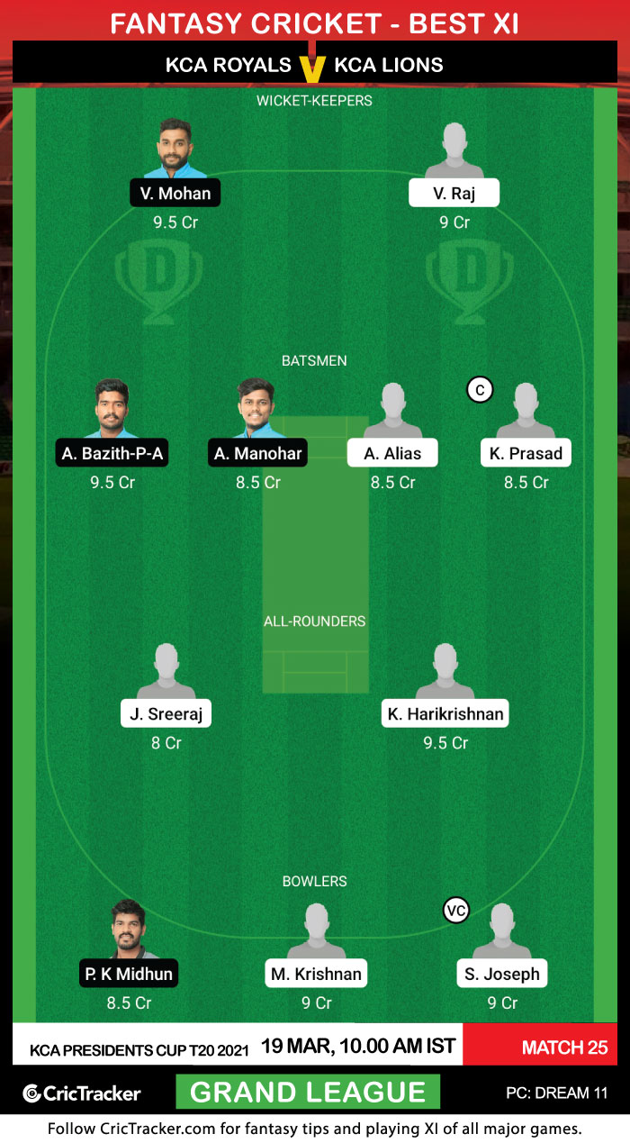 The 25th match of the KCA Presidents Cup T20 2021 will be played between KCA Royals and KCA Lions on 19th March at Sanatana Dharma College Ground, Alappuzha, Kerala.