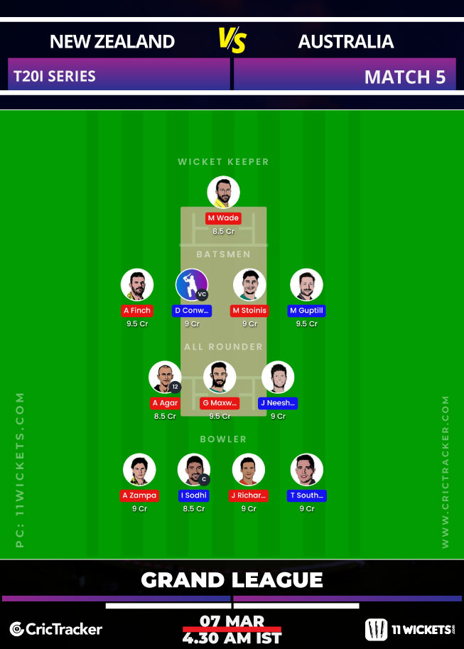 Suggested Playing XI No.1 for NZ vs AUS 11Wickets Fantasy Cricket: