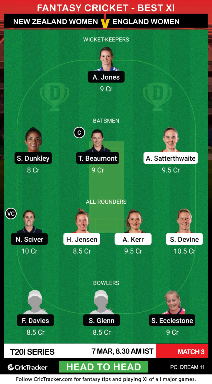 Suggested Playing XI No.1 for NZ-W vs EN-W Dream11 Fantasy Cricket: