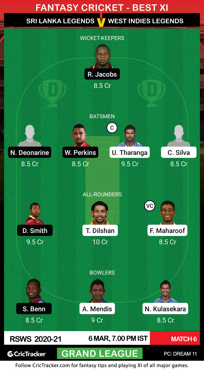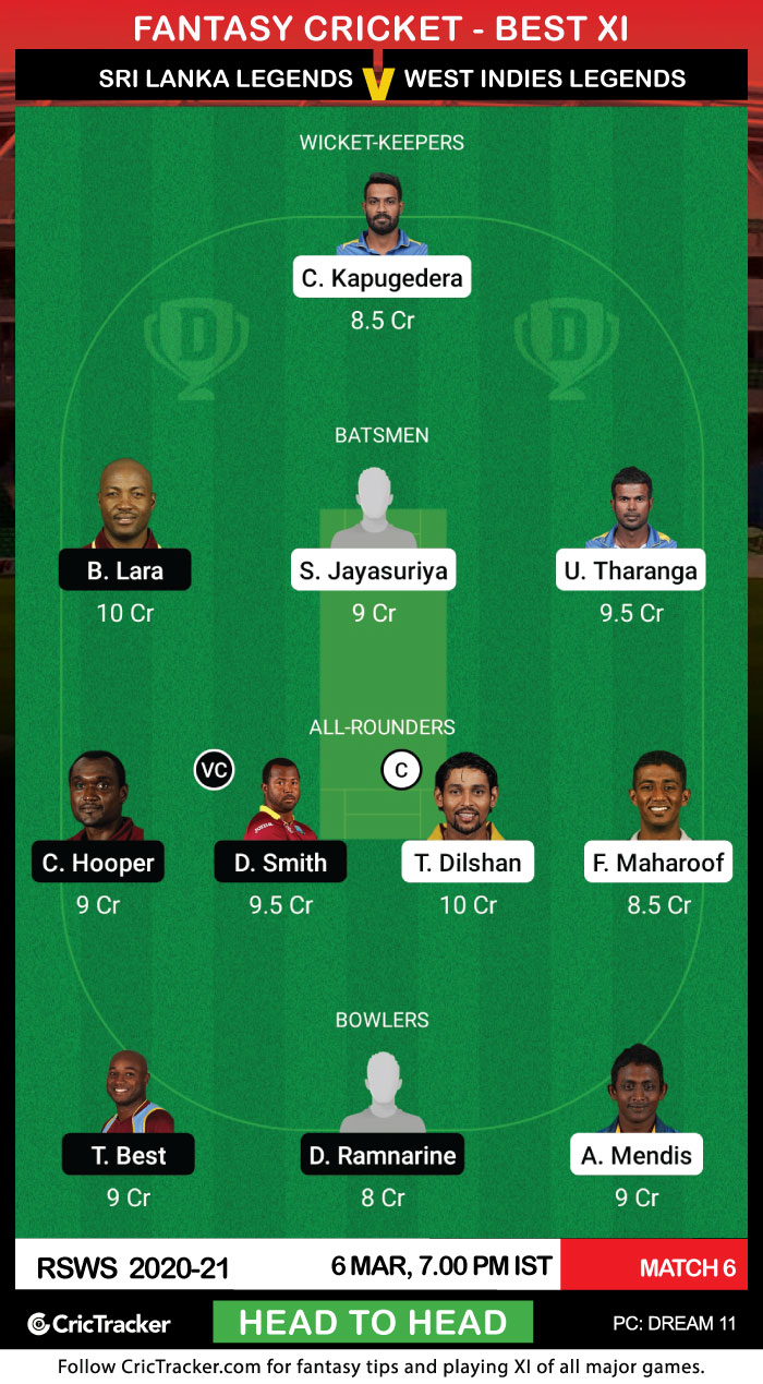 Suggested Playing XI No.1 for SL-L vs WI-L Dream11 Fantasy Cricket: