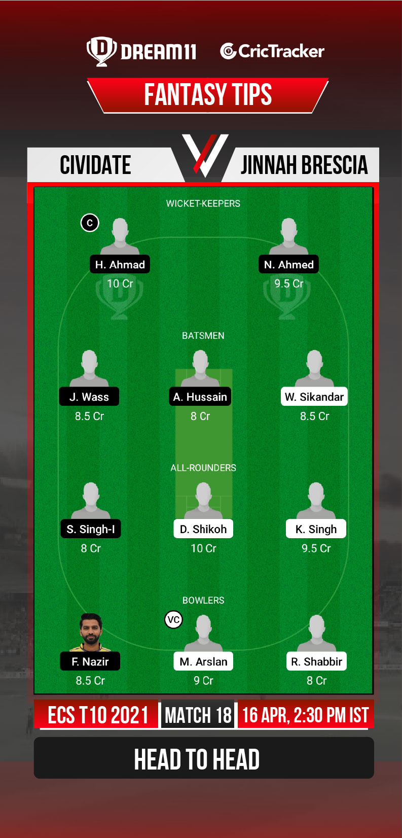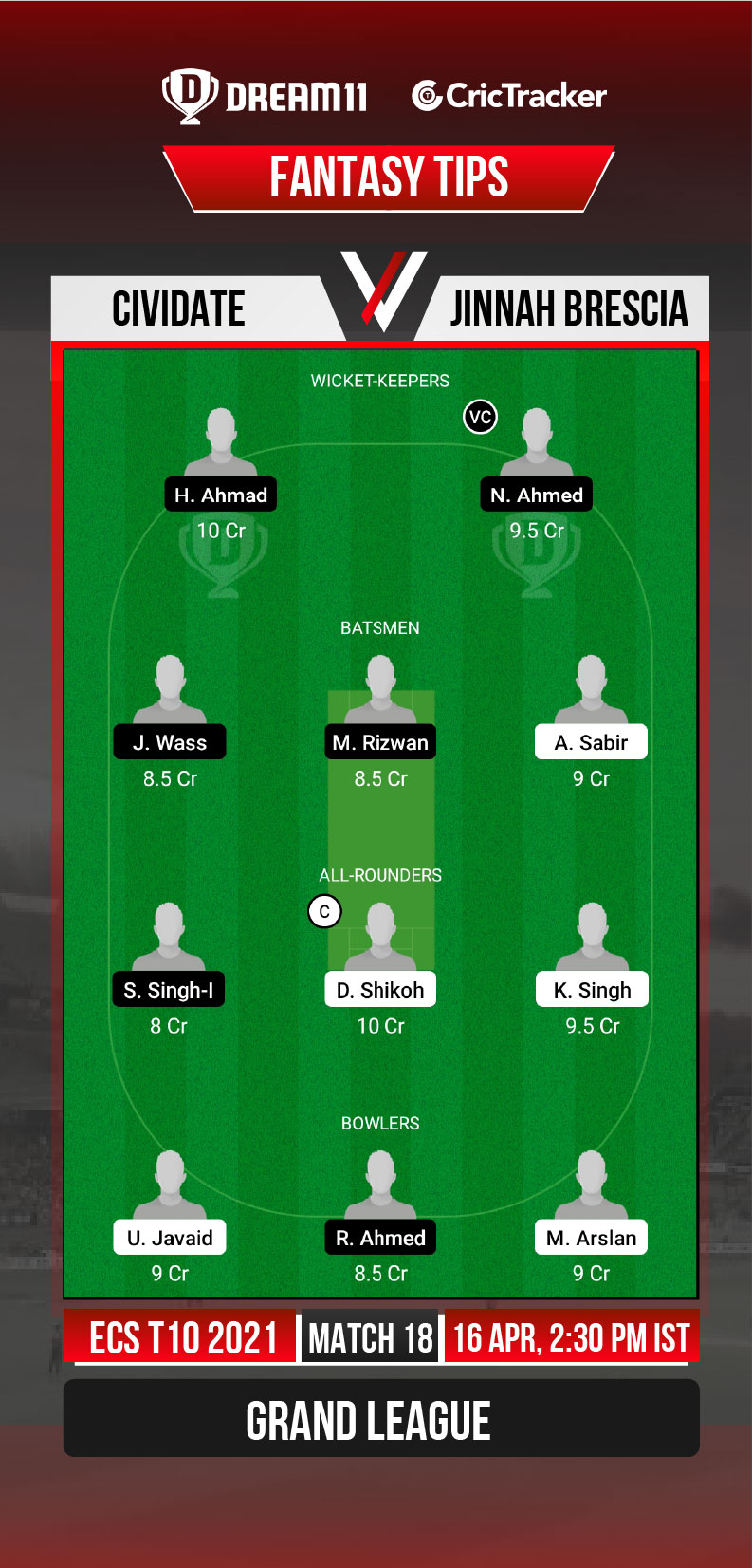 Cividate skipper Kuljinder Singh was the player of the match in the previous game against Pak Lions Ghedi for his impressive bowling performances. He picked up 4 wickets by just conceding 10 runs.