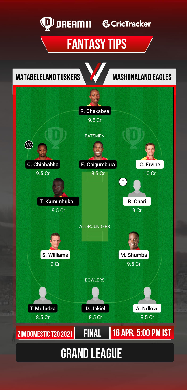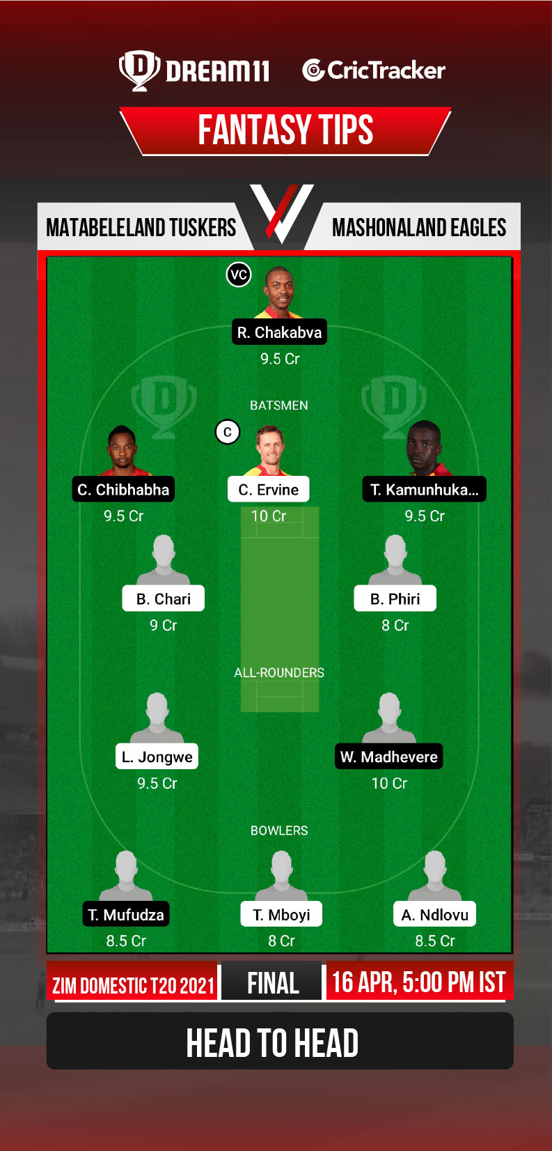 Matabeleland Tuskers won their last 2 matches by a huge margin of 78 runs and 63 runs against Mid West Rhinos and Mountaineers respectively, which helped them finish at the top of the table in the league standings. Matabeleland Tuskers have an upper hand going into the final, since they had beaten Mashonaland Eagles in the league stages.
