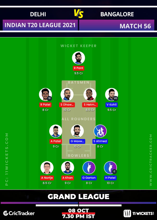 Rishabh Pant, Virat Kohli (vc), Shikhar Dhawan, Shimron Hetmyer, Glenn Maxwell, Axar Patel, Shahbaz Ahmed, Avesh Khan, Harshal Patel (c), Anrich Nortje, George Garton