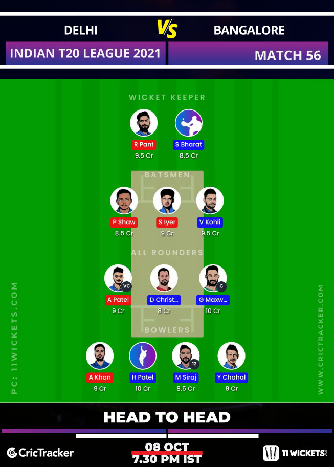 Rishabh Pant, Srikar Bharat, Prithvi Shaw, Virat Kohli, Shreyas Iyer, Dan Christian, Glenn Maxwell (c), Axar Patel (vc), Yuzvendra Chahal, Avesh Khan, Harshal Patel