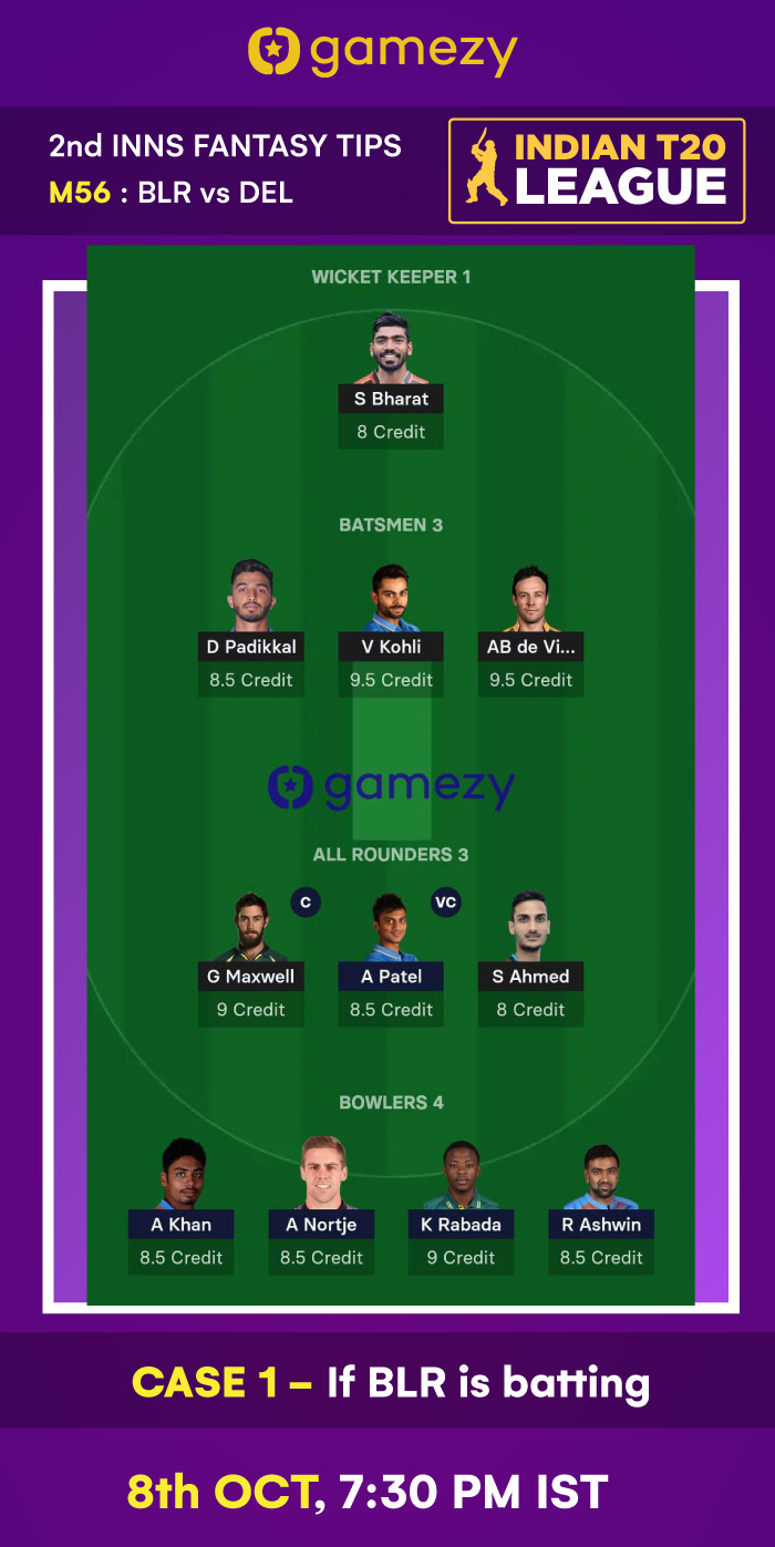 KS Bharat, Devdutt Padikkal, Virat Kohli, AB de Villiers, Glenn Maxwell (C), Axar Patel (VC), Shahbaz Ahmed, Avesh Khan, Anrich Nortje, Ravi Ashwin, Kagiso Rabada
