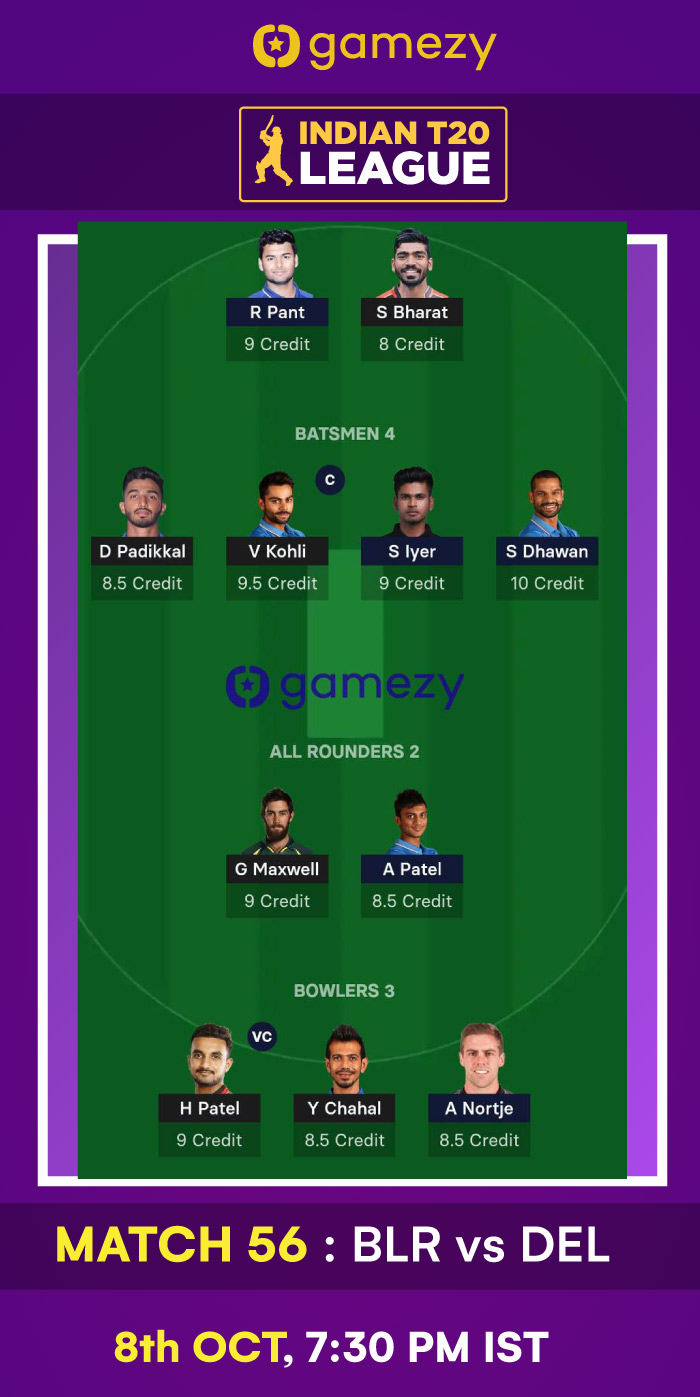 Rishabh Pant, KS Bharat, Devdutt Padikkal, Virat Kohli (C), Shreyas Iyer, Shikhar Dhawan, Glenn Maxwell, Axar Patel, Hrshal Patel (VC), Yuzvendra Chahal, Anrich Nortje.