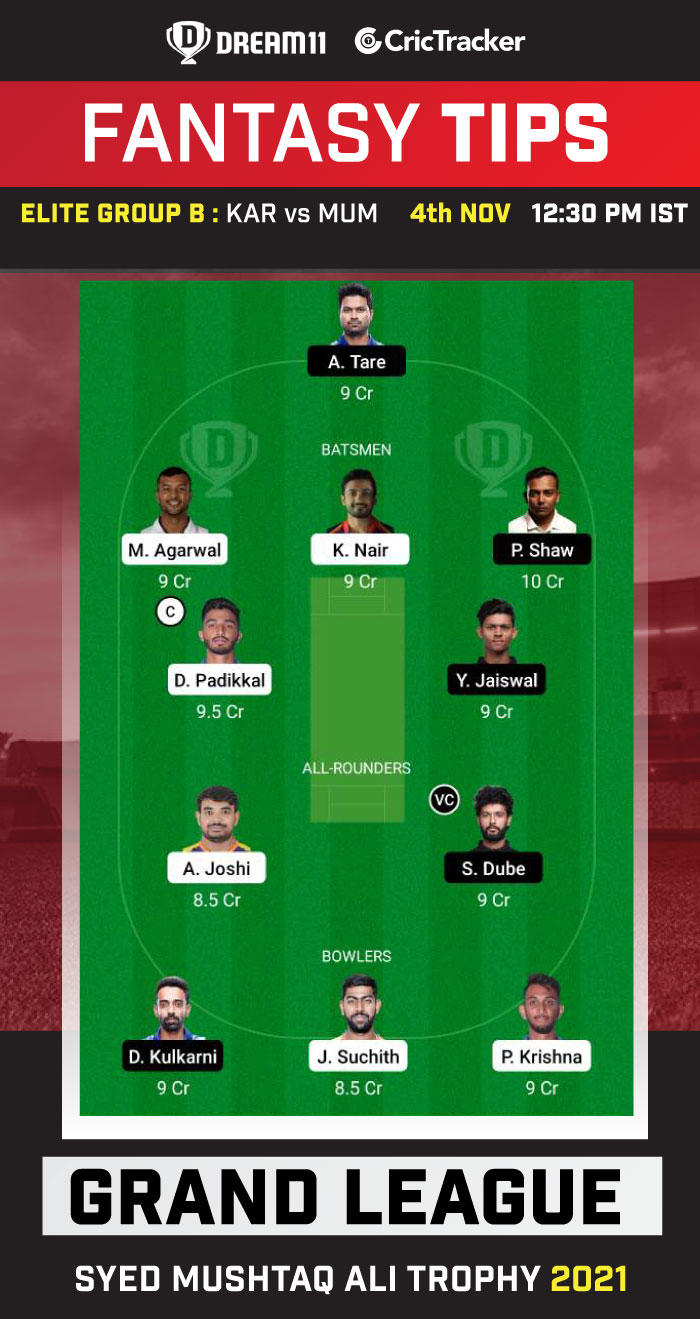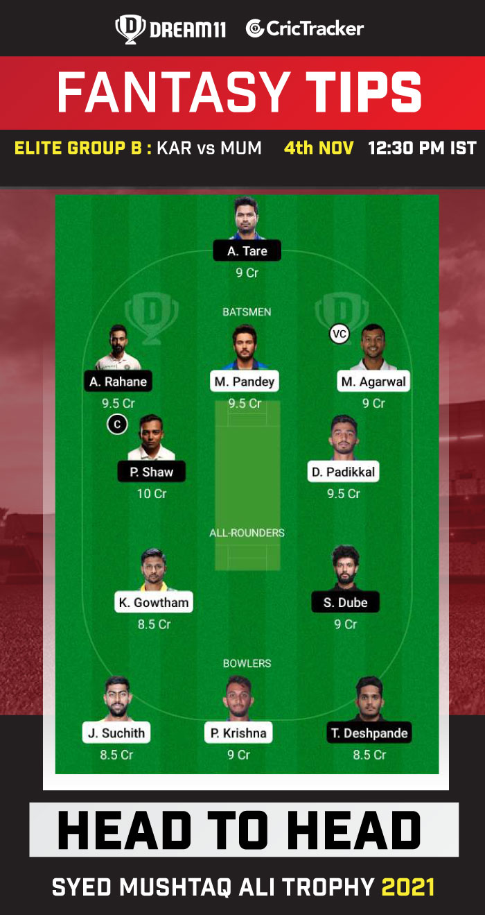 Suggested Playing XI No.1 for KAR vs MUM Dream11 Fantasy Cricket: