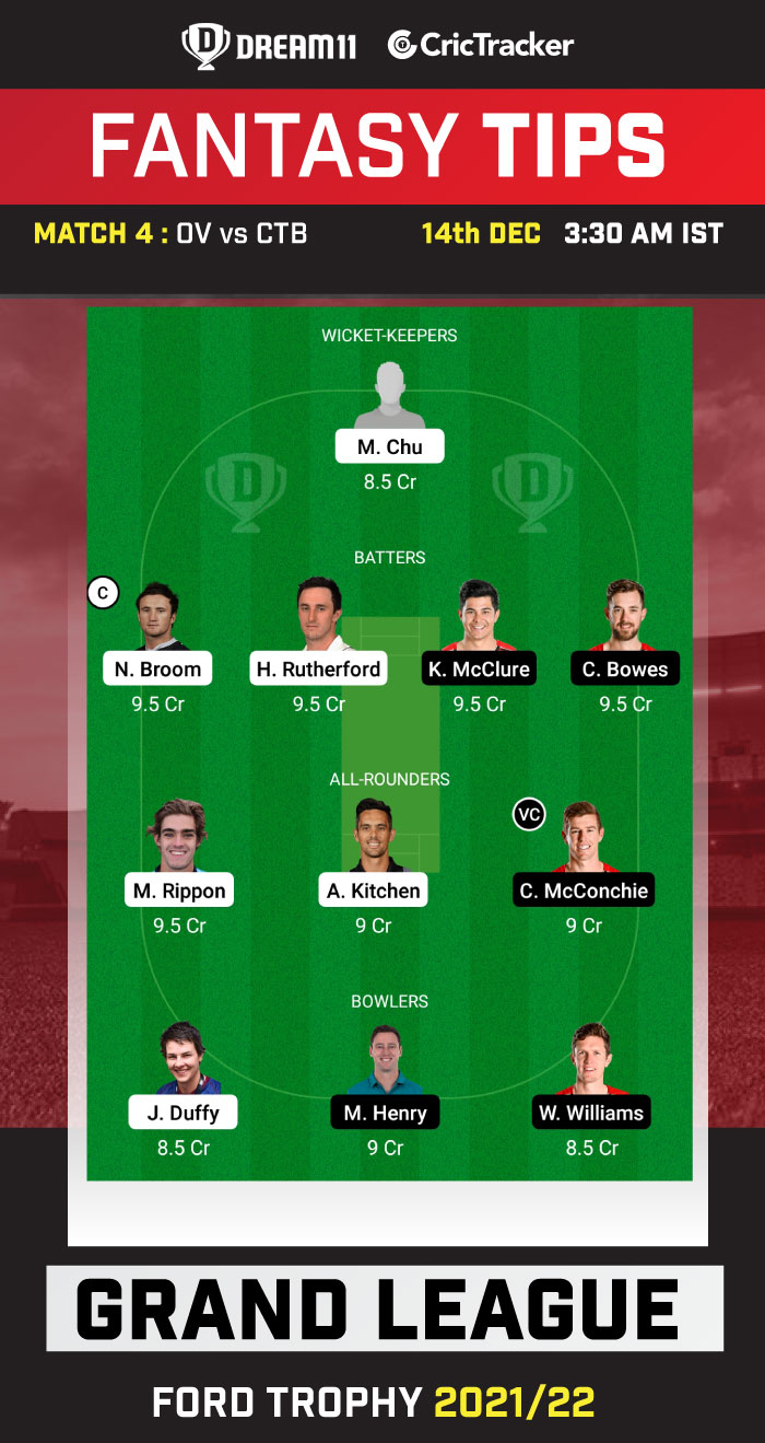 Max Chu, Neil Broom (c), Hamish Rutherford, Ken McClure, Chad Bowes, Michael Rippon, Anaru Kitchen, Cole McConchie (vc), Jacob Duffy, Matt Henry, Will Williams